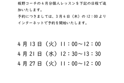 • 【2021/2/19 大人気!板野コーチ個人レッスン追加のお知らせです!】