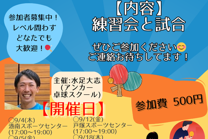 🏓【第24回アンカーリーグ!】🏓 <レベル問わずの初心者大歓迎!> こんにちは!☀️ 8/28(木)「スポーツクラブNAS戸塚」さんにて、【アンカーリーグ!】を開催いたします!✨ おかげさまで第24回...