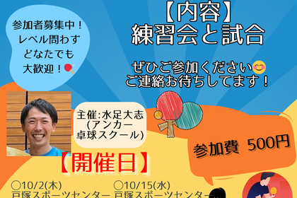🏓【BeAmbitious(スポセン練習)10月予定のお知らせ!🔥】🏓 こんにちは!☀️アンカーの水足です😊 BeAmbitious(スポセン練習)のお知らせです!🍀 充実した練習会に致しますので、ぜひご参加いただきたい...