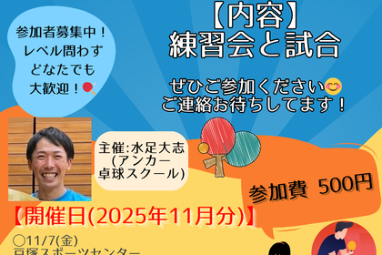 🏓【BeAmbitious(スポセン練習)11月予定のお知らせ!🔥】🏓 こんにちは!☀️アンカーの水足です😊 BeAmbitious(スポセン練習)のお知らせです!🍀 充実した練習会に致しますので、ぜひご参加いただきたい...