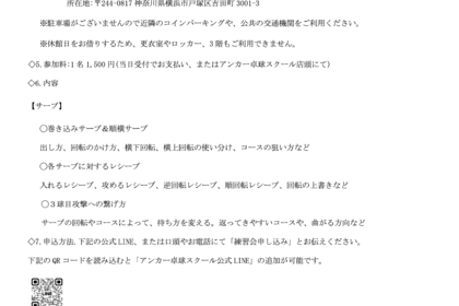 こんばんは! いつもアンカー卓球スクールをご利用いただき誠にありがとうございます。 11月12日(水)〜11月23日(日)の空き状況をお知らせいたします。 ◯ 異質対策練習会 11/12(水)9:00~10:30 空き4名 ...