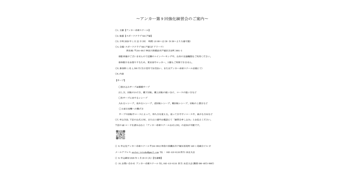 1/22(木)開催の「強化練習会&アンカーリーグ」のお知らせです!